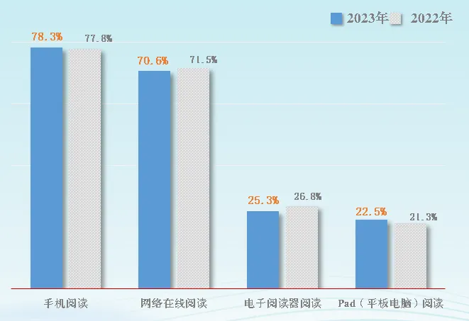 进一步对各类数字化阅读载体的接触情况进行分析发现,2023年有78.3%的成年国民进行过手机阅读,较2022年的77.8%增长了0.5个百分点;70.6%的成年国民通过电脑端进行网络在线阅读,较2022年的71.5%下降了0.9个百分点;25.3%的成年国民在电子阅读器上阅读,比2022年的26.8%减少了1.5个百分点;22.5%的成年国民使用pad(平板电脑)进行阅读,较2022年的21.3%增长了1.2个百分点。