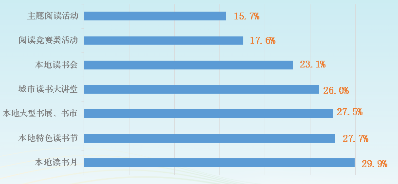 2023年,我国成年国民对全民阅读品牌活动的知晓率达74.1%,较2022年的73.7%增长了0.4个百分点。其中,“本地读书月”的影响力最大,选择比例近三成(29.9%);“本地特色读书节(如大学生读书节、机关读书节等)”“本地大型书展、书市活动”“城市读书大讲堂”的选择比例相对较高,分别为27.7%、27.5%和26.0%;“本地读书会”的选择比例为23.1%;“阅读竞赛类活动”和“主题阅读活动(如红色主题阅读、‘学习强国’应用推广等)”的选择比例分别为17.6%和15.7%。