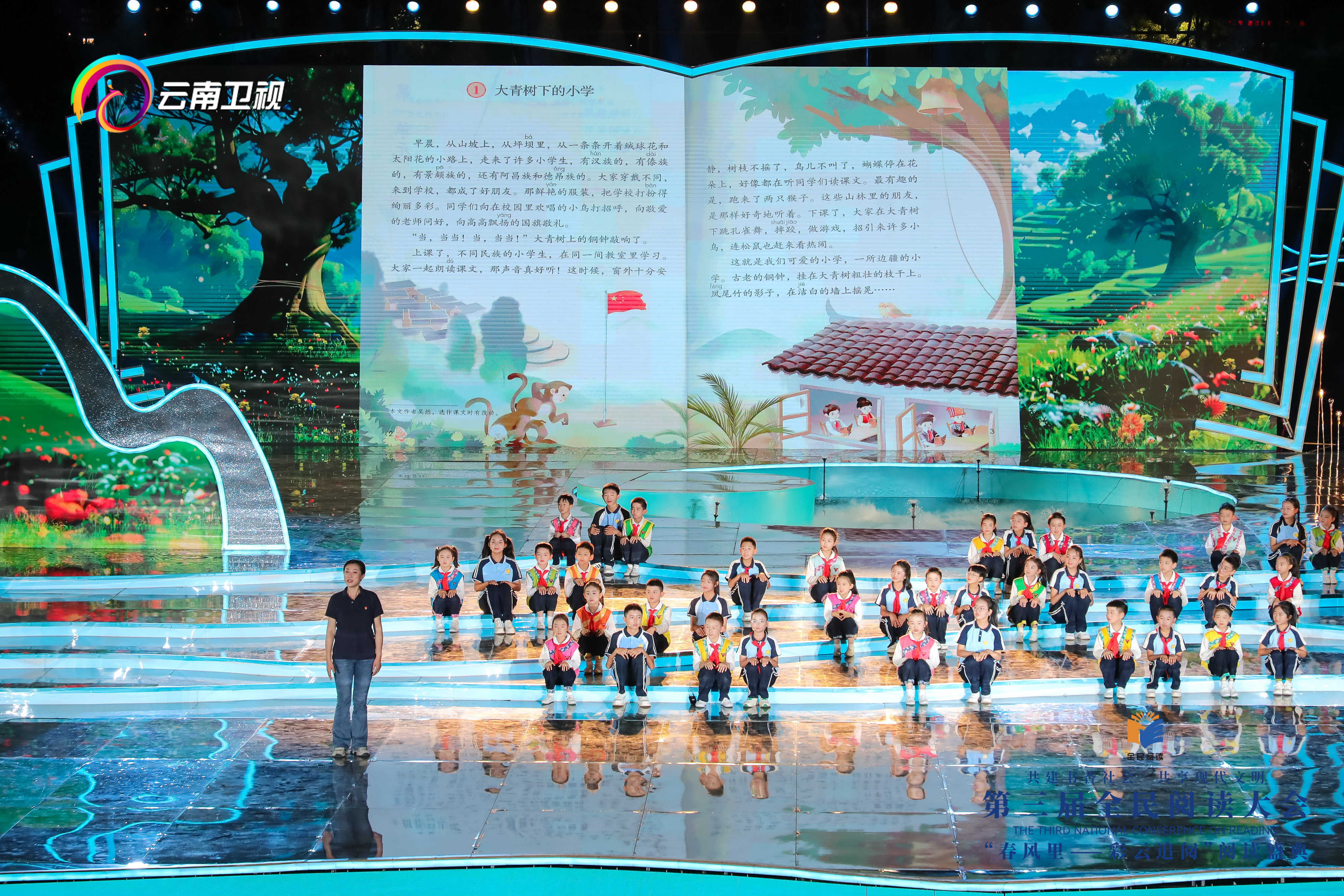 阅读盛典将小学课文搬上了舞台。云南师范大学附属小学和保山昌宁县漭水镇中心小学孩子们的共同演绎了云南籍作家吴然的散文《大青树下的小学》。吴然老师给孩子们讲述创作的初衷,鼓励孩子们铸牢中华民族共同体意识。