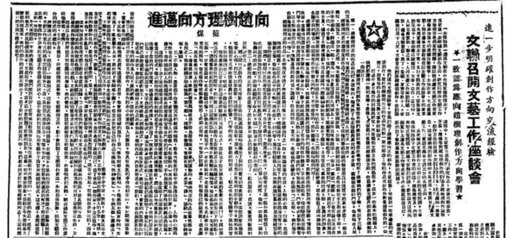 “文艺座谈会”以后,艺术各部门都达到了重要的收获,开创了新的局面,赵树理同志的作品是文学创作上的一个重要收获,是毛泽东文艺思想在创作上实践的一个胜利。