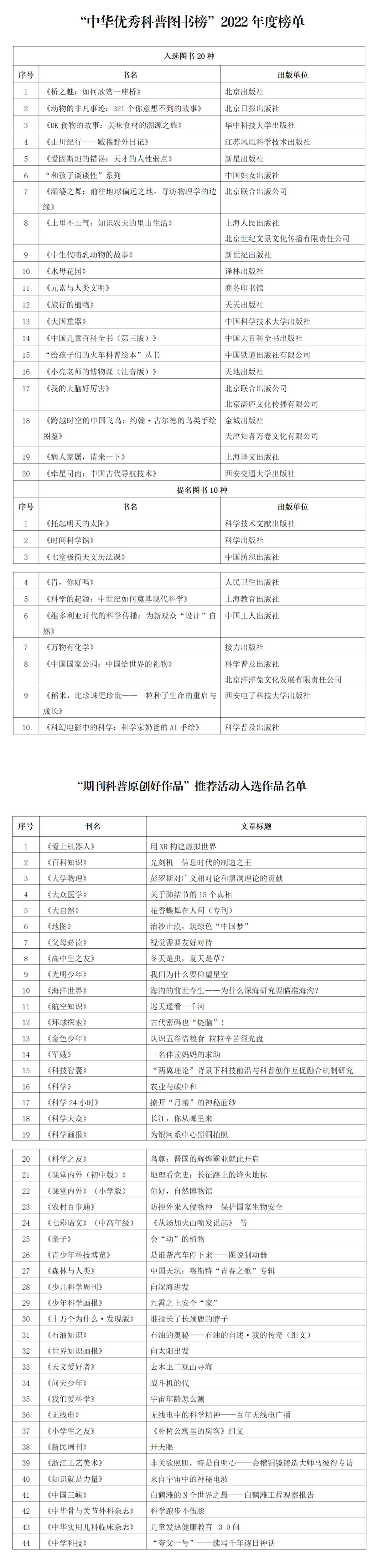 “中华优秀科普图书榜”2022年度榜单共20种图书获得入选推荐,10种图书获得提名推荐。