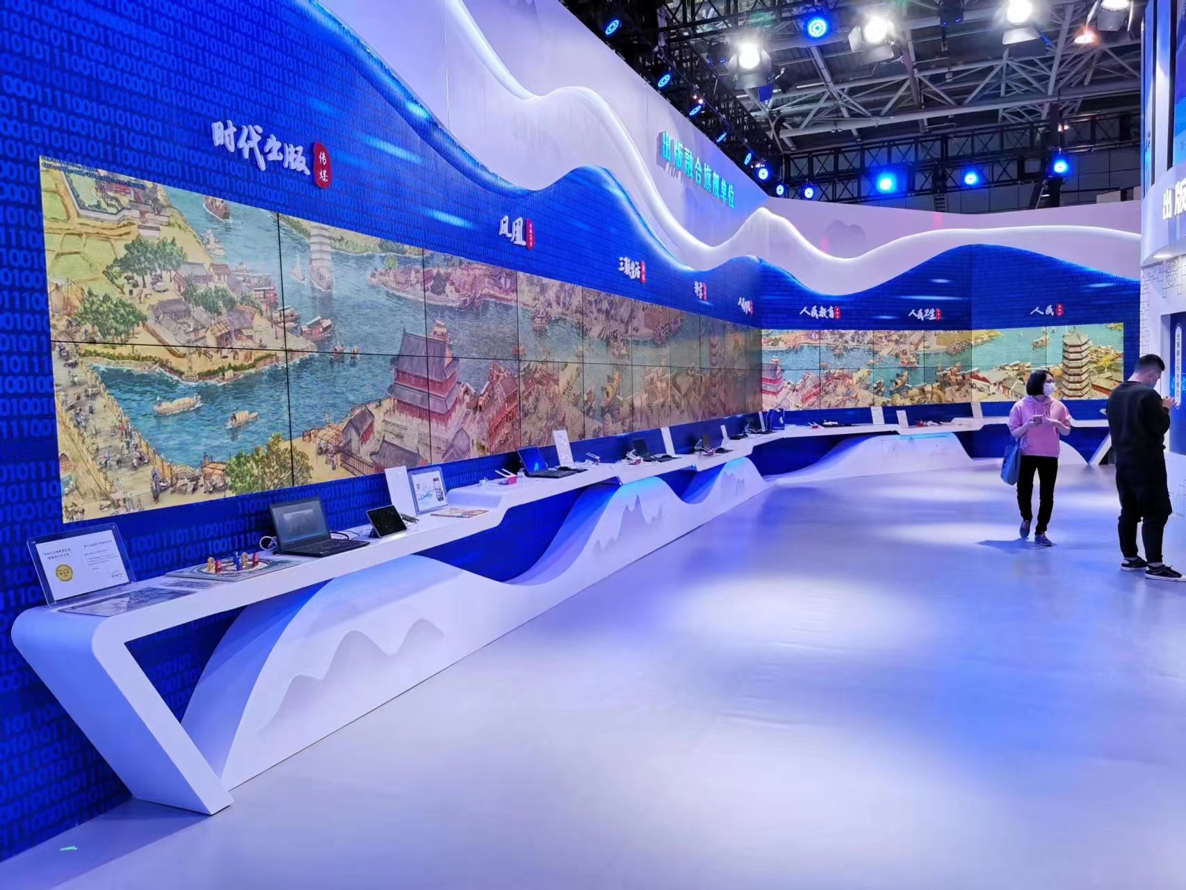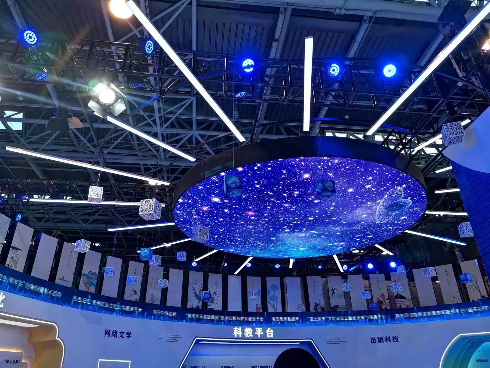 其中,精品项目展区强调传统文化的底蕴和现代科技的融合。展区上方是取材自精品项目中的二十四节气敦煌壁画,穹顶阵列展示近3年来国家新闻出版署数字出版精品遴选推荐计划选出的项目二维码。展区重点展出传统文化、科教平台、少儿精品以及网络文学和出版科技标准精品。