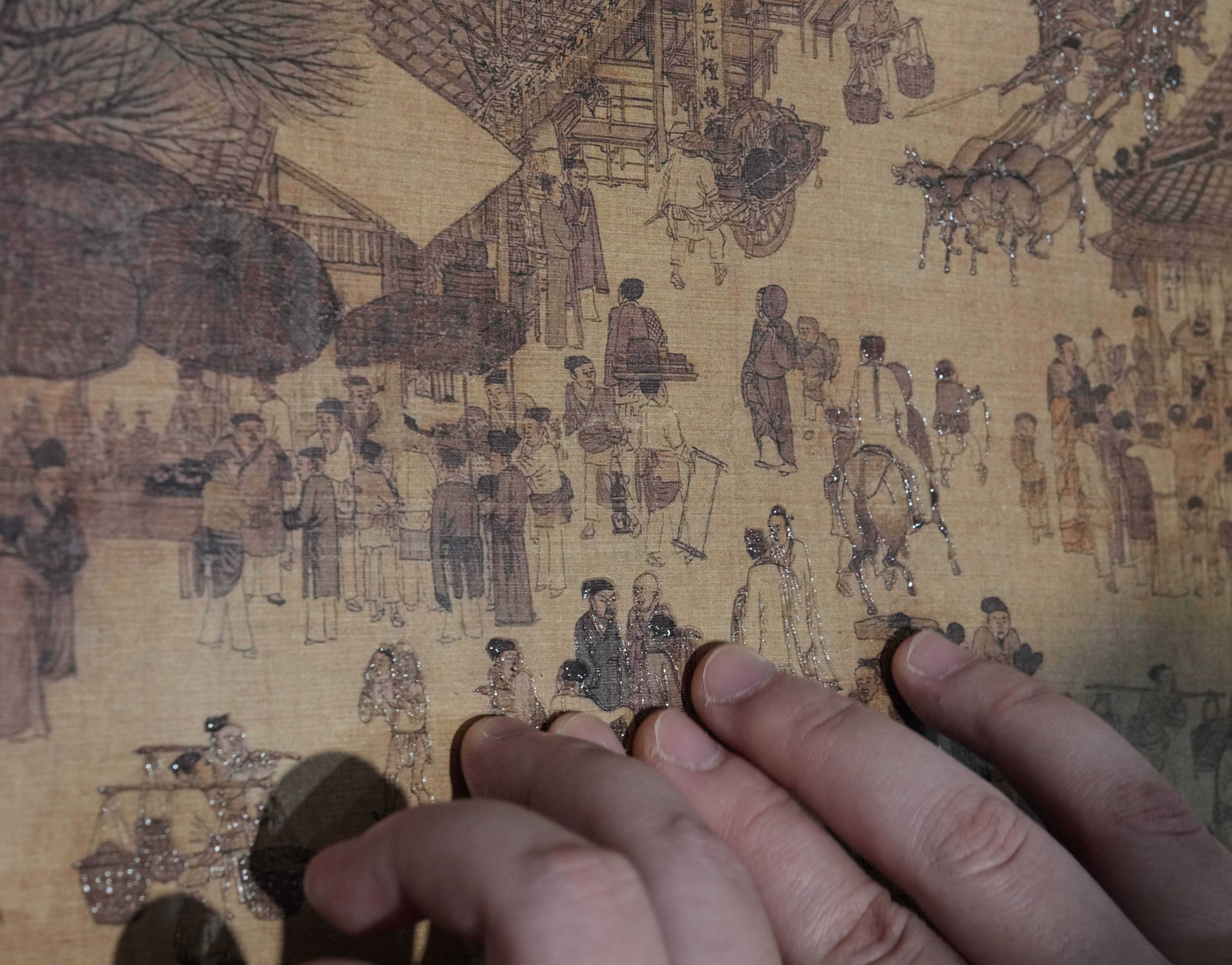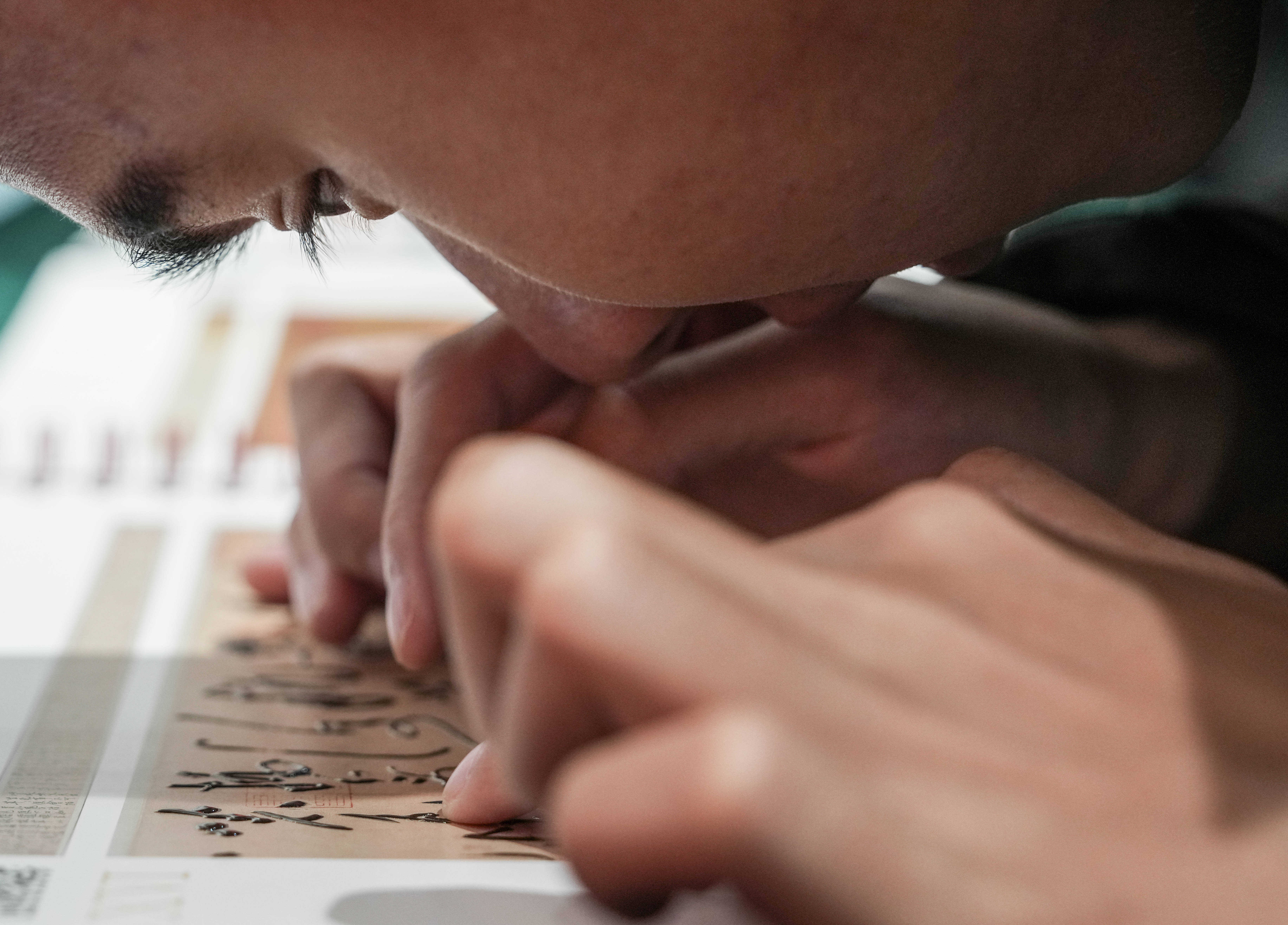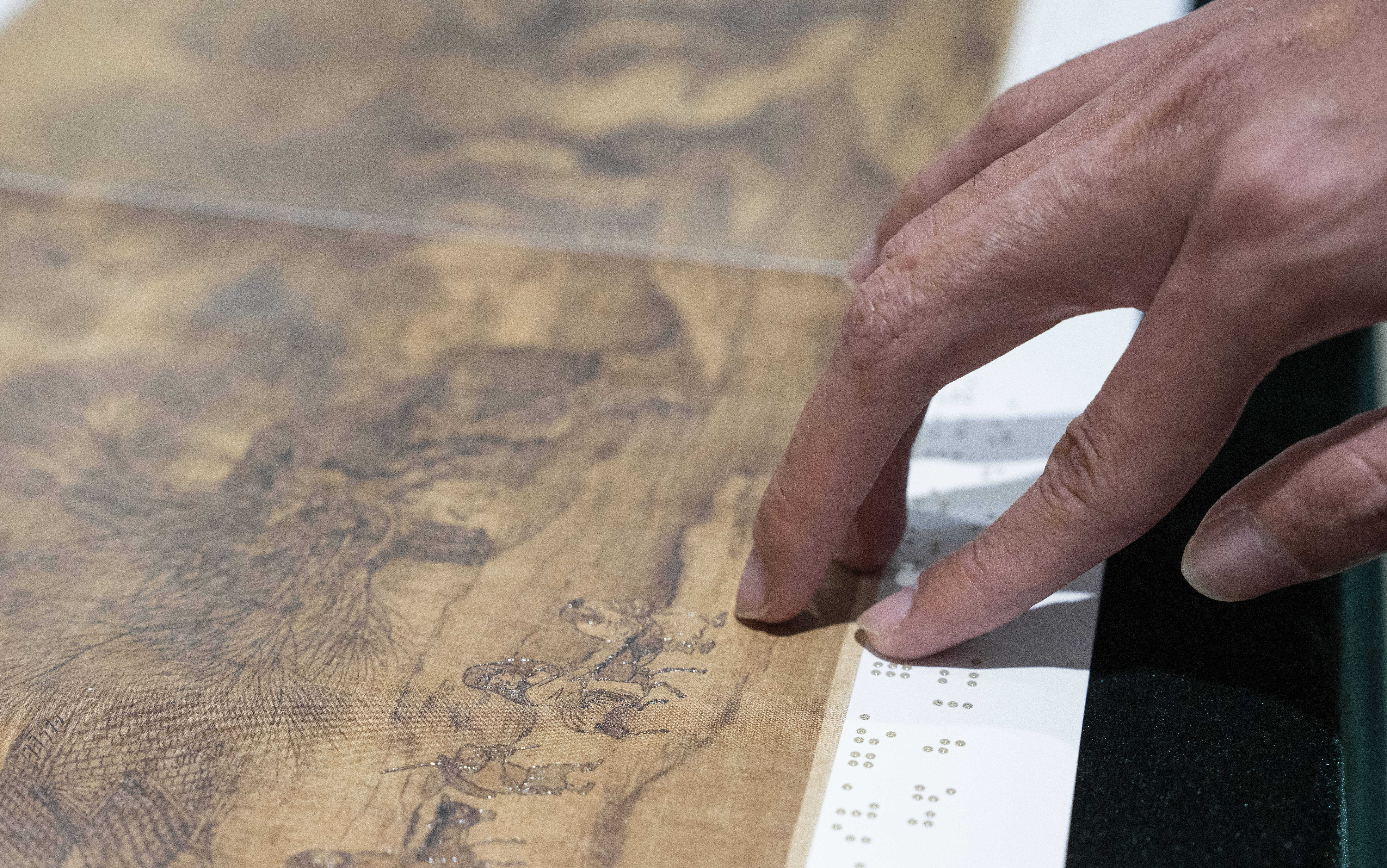 10月13日,视障人士在发布会后,欣赏无障碍版《触摸故宫珍宝》中的黄庭坚草书《诸上座帖》。 新华社记者 殷刚 摄