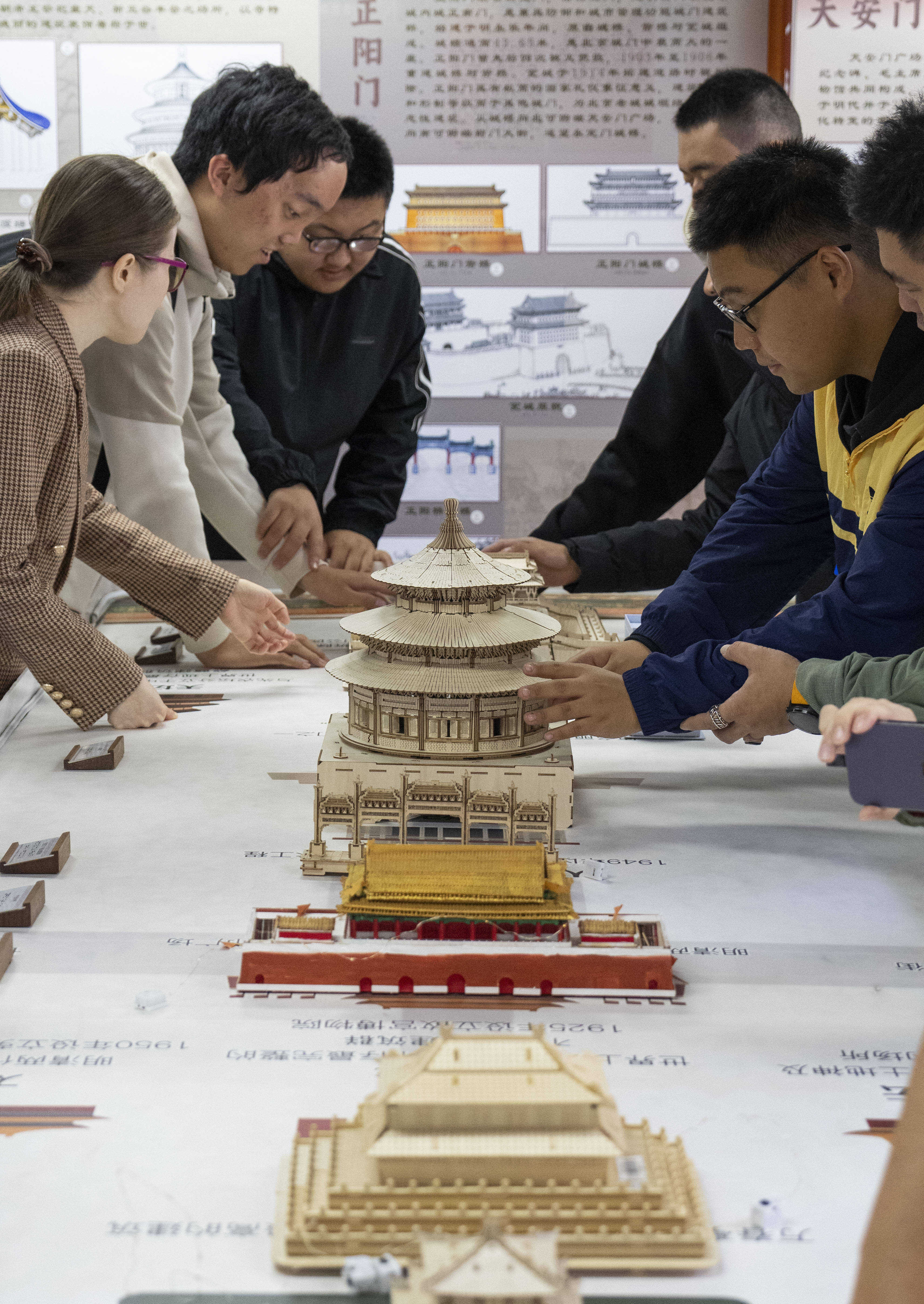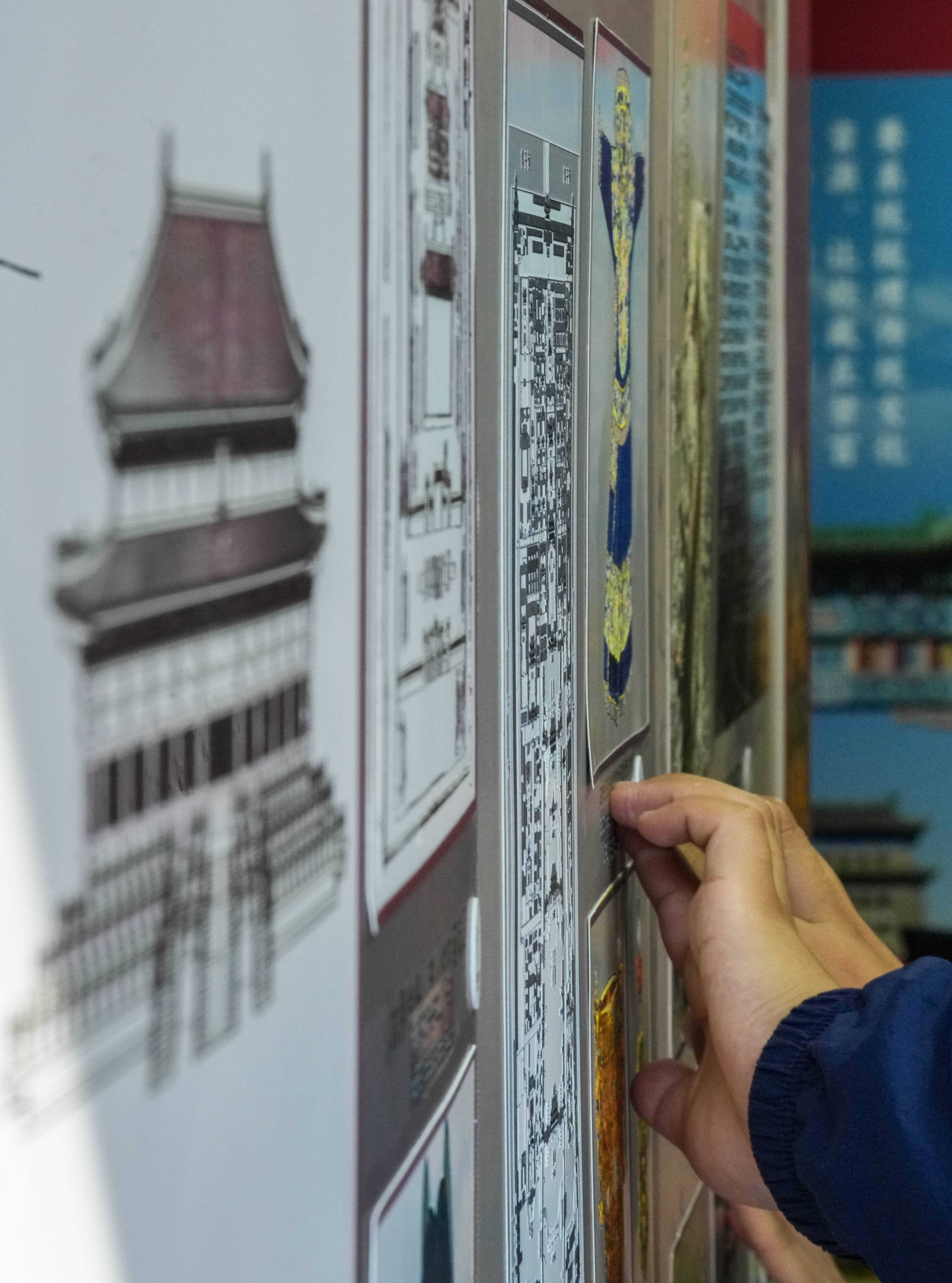 10月13日,视障人士在工作人员帮助下,触摸北京中轴线建筑模型。