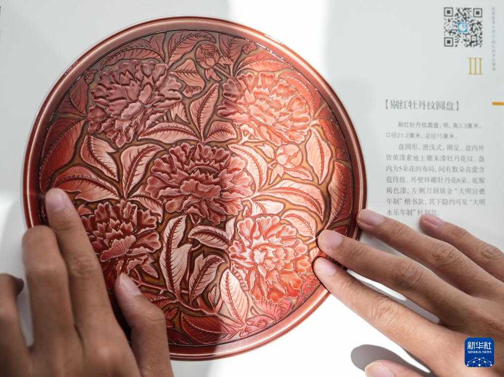 10月13日,视障人士在发布会后,欣赏无障碍版《触摸故宫珍宝》中的剔红牡丹纹圆盘。 新华社记者 殷刚 摄