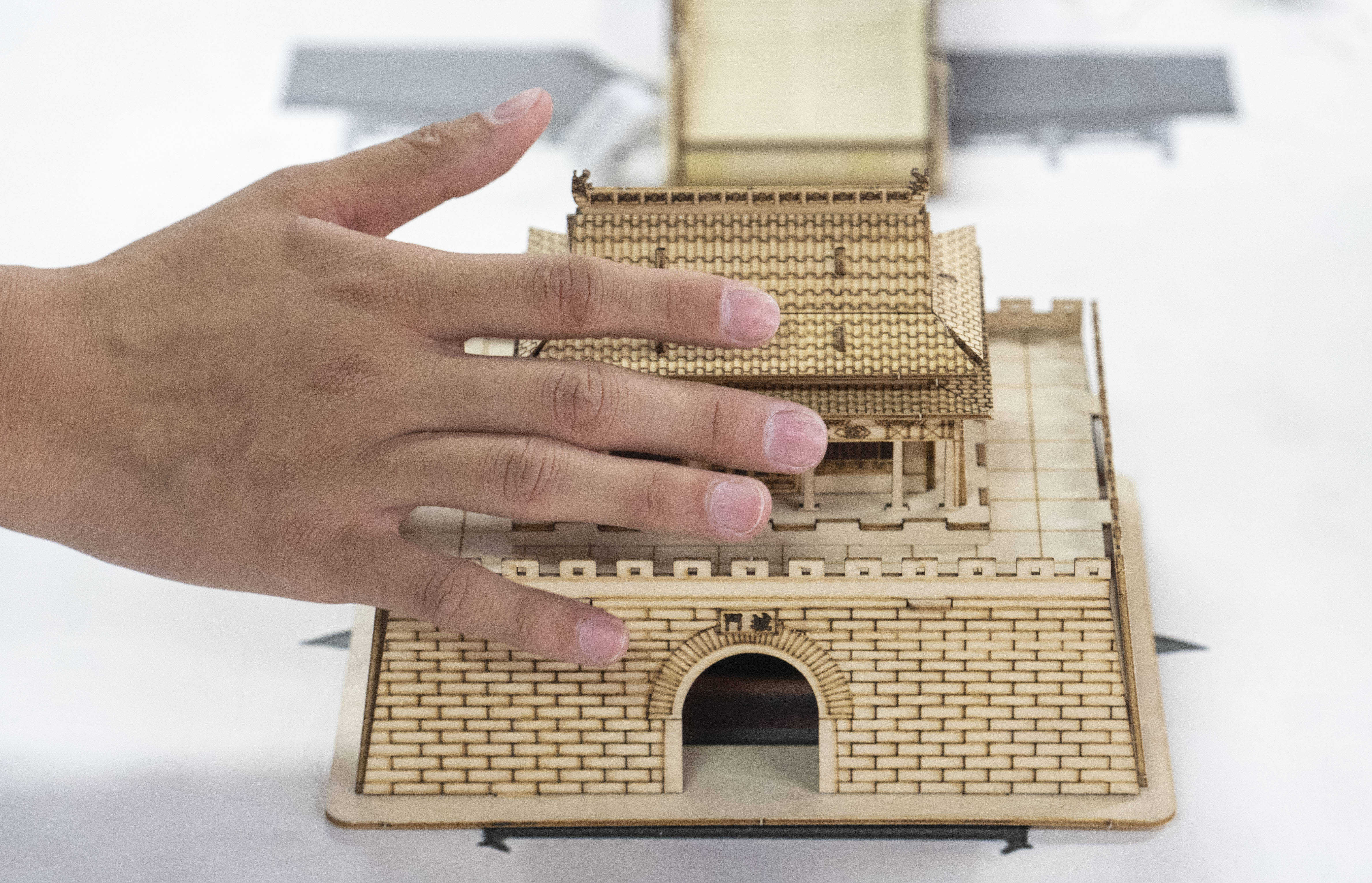 10月13日,视障人士在发布会后,触摸北京中轴线建筑模型。
