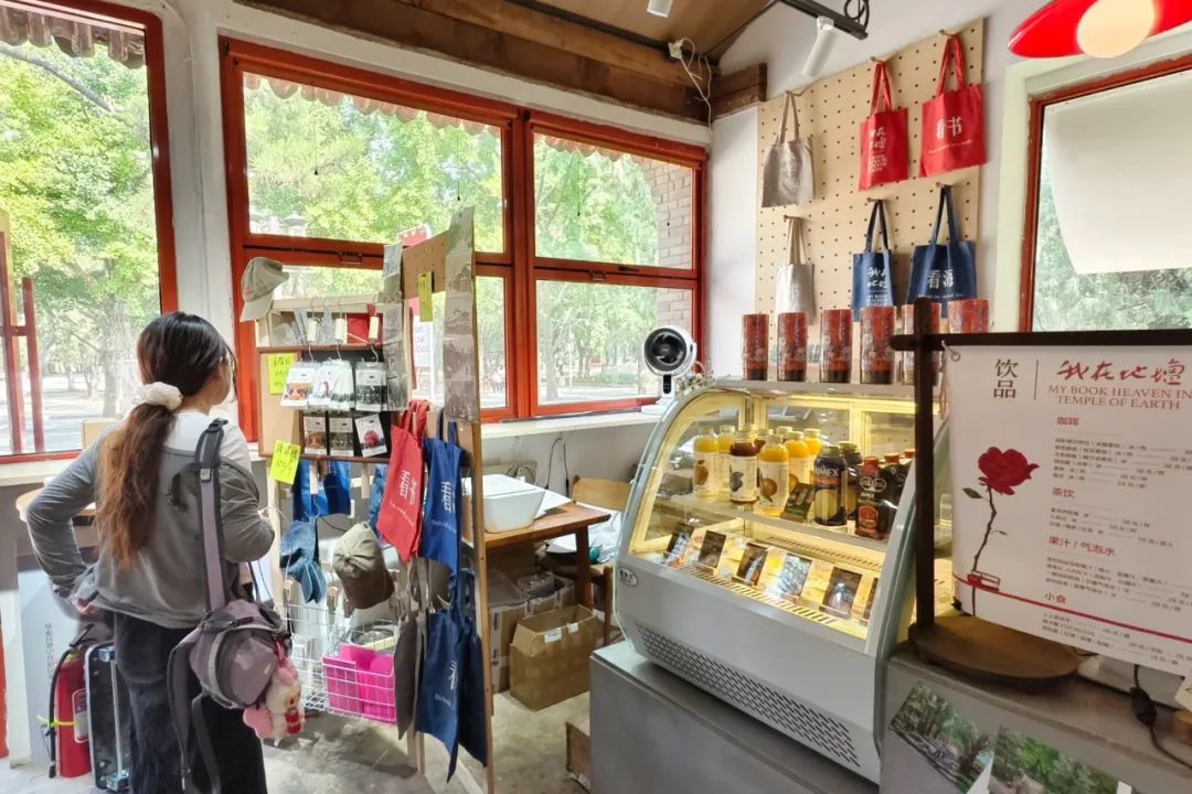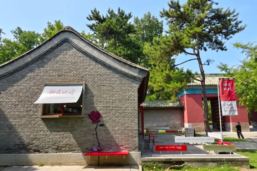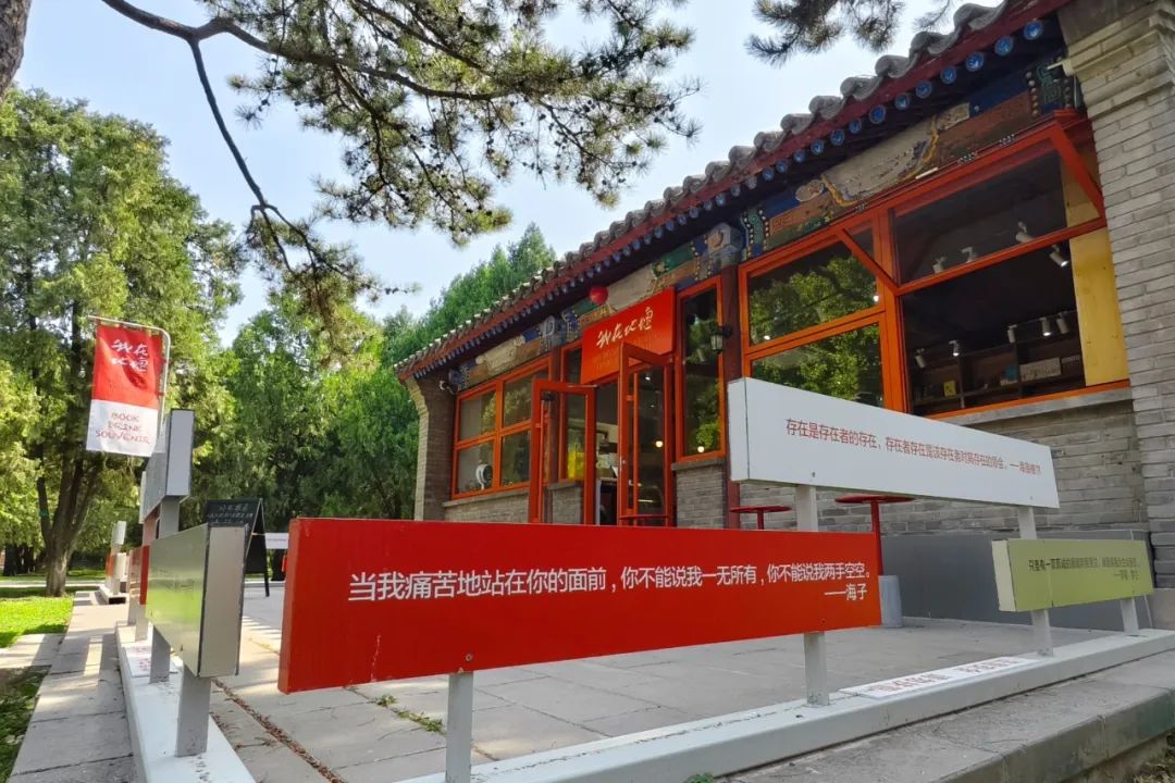 从地坛公园北门进入,再前行200米,穿过红色北天门,右手边映现一处小巧的灰瓦红柱的建筑,门头悬着橘色匾额——“我在地坛” 。走进“我在地坛”书店,40多平方米的书店和室外的树木草坪浑然一体,书香、茶香和青草的气息混搭,别有一番雅趣。书店共有2000余册图书,作家史铁生的著作无疑是书店最重要的存在,《我与地坛》《病隙碎笔》《我的遥远的清平湾》《我的丁一之旅》等陈列在最醒目的位置。书店座位全部免费,这里没有wi-fi,也没有电源插座,店主希望读者步入书店就放下手机,专注阅读。