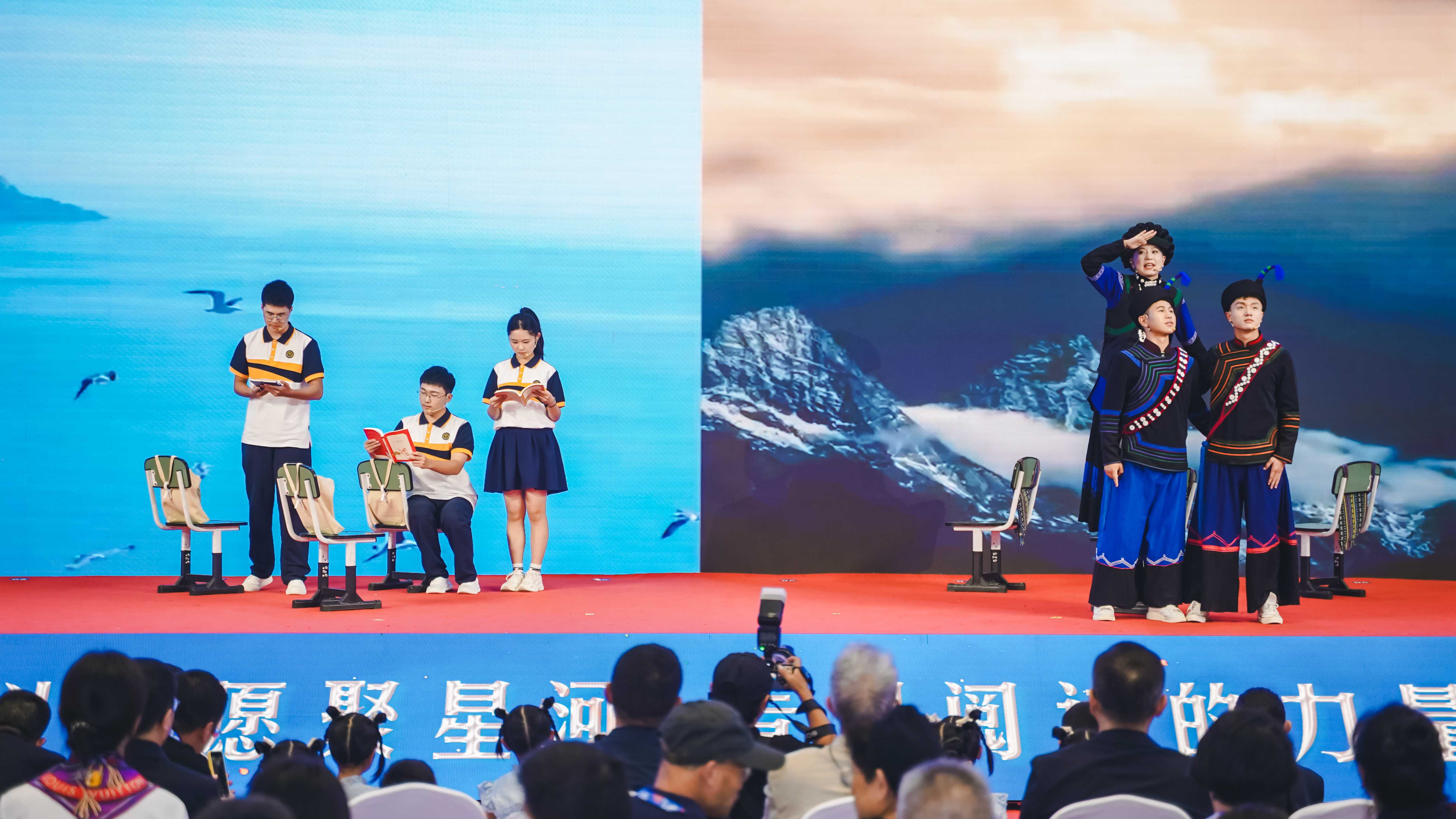 随着音乐渐起,两地学子分别从“海边”和“山间”走向舞台中央。“直到那一本书的出现……”话音落下,宁波学子将手中的书籍,轻轻放入凉山学子的手中。