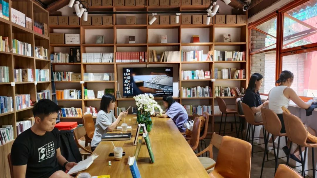 从地坛公园北门进入,再前行200米,穿过红色北天门,右手边映现一处小巧的灰瓦红柱的建筑,门头悬着橘色匾额——“我在地坛” 。走进“我在地坛”书店,40多平方米的书店和室外的树木草坪浑然一体,书香、茶香和青草的气息混搭,别有一番雅趣。书店共有2000余册图书,作家史铁生的著作无疑是书店最重要的存在,《我与地坛》《病隙碎笔》《我的遥远的清平湾》《我的丁一之旅》等陈列在最醒目的位置。书店座位全部免费,这里没有wi-fi,也没有电源插座,店主希望读者步入书店就放下手机,专注阅读。